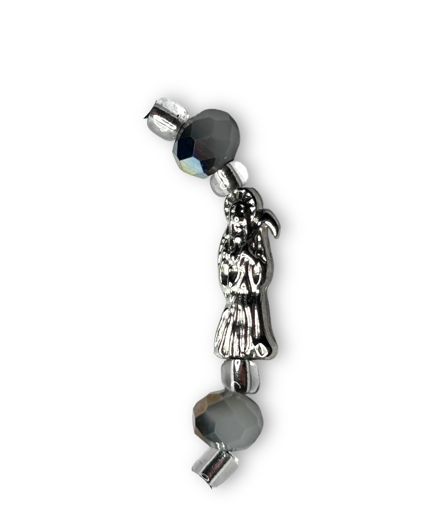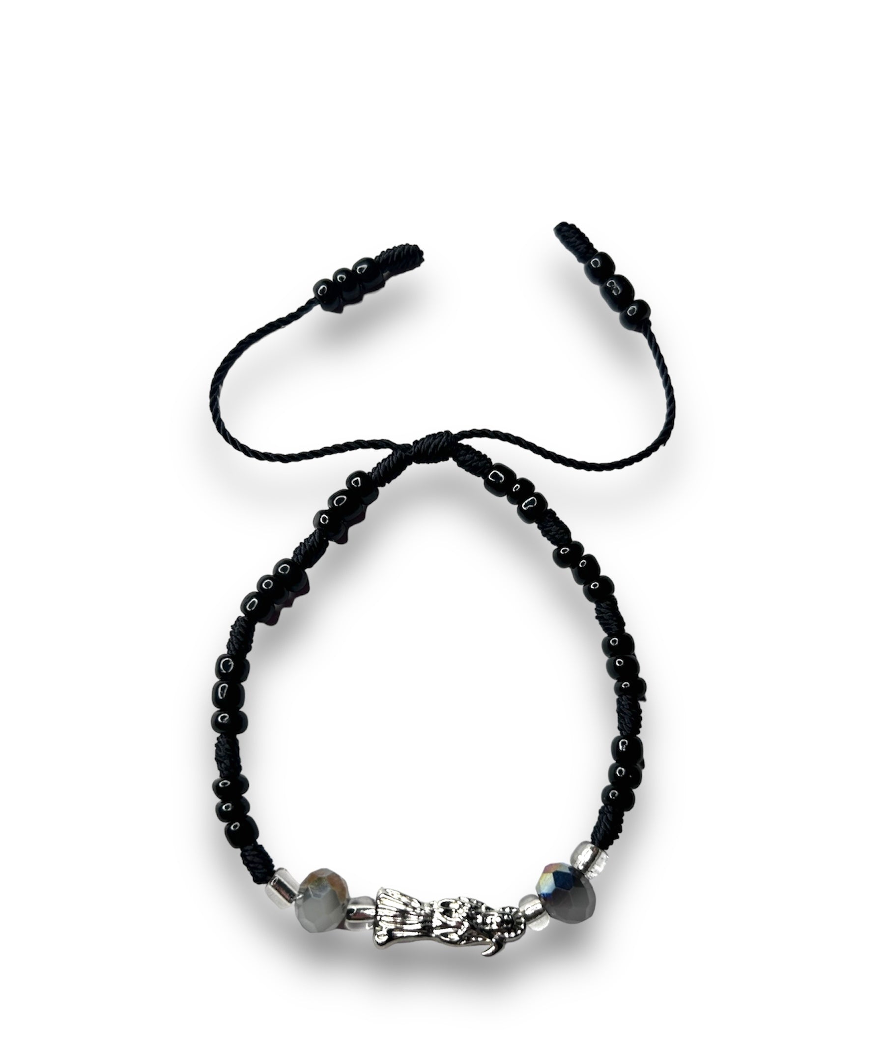 The color Black is associated with tranquility, wisdom, and protection, while the skull symbol can represent transformation, mortality, and the shedding of the old self. When combined, a white, Black & silver Santa M bracelet provides spiritual protection, ward off negative energies, and promote inner peace. It's often worn as a reminder of the transient nature of life and the importance of embracing change and personal growth.