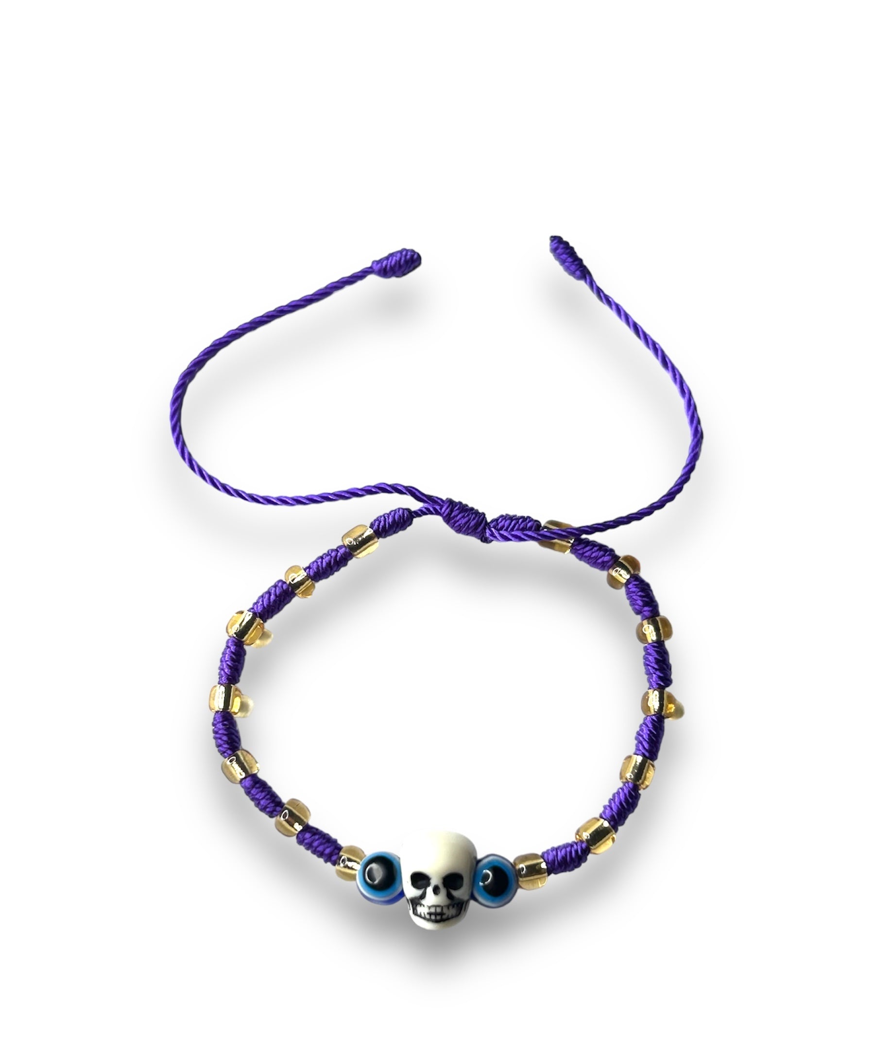 The Purple Skull Head Bracelet with Double Nazar Eye features a striking blend of vibrant purple skulls and dual Nazar eyes, symbolizing spiritual protection and warding off negative energy. The skulls represent transformation and mortality, while the Nazar eyes, known for their protective properties, guard against envy and harm. This unique bracelet combines fashion with powerful spiritual meaning, offering both style and safeguarding to its wearer.