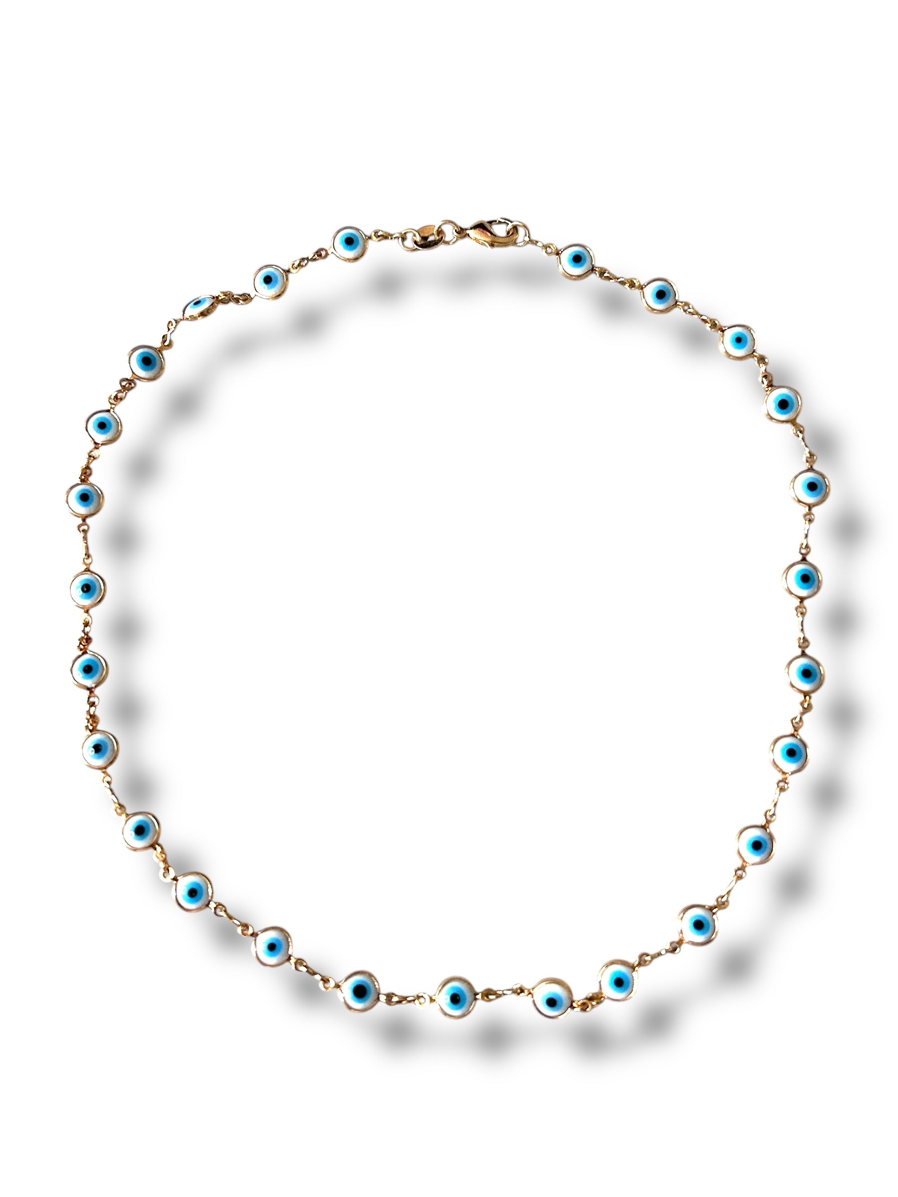 This gold-filled necklace features multiple white Nazar Eyes—symbols of spiritual clarity, protection, and elevated presence. White reflects purity and light, while each eye silently deflects envy and negative energy. Worn as a shield for your aura, this piece lets you move with quiet strength, attract attention, and influence the room—without saying a word.