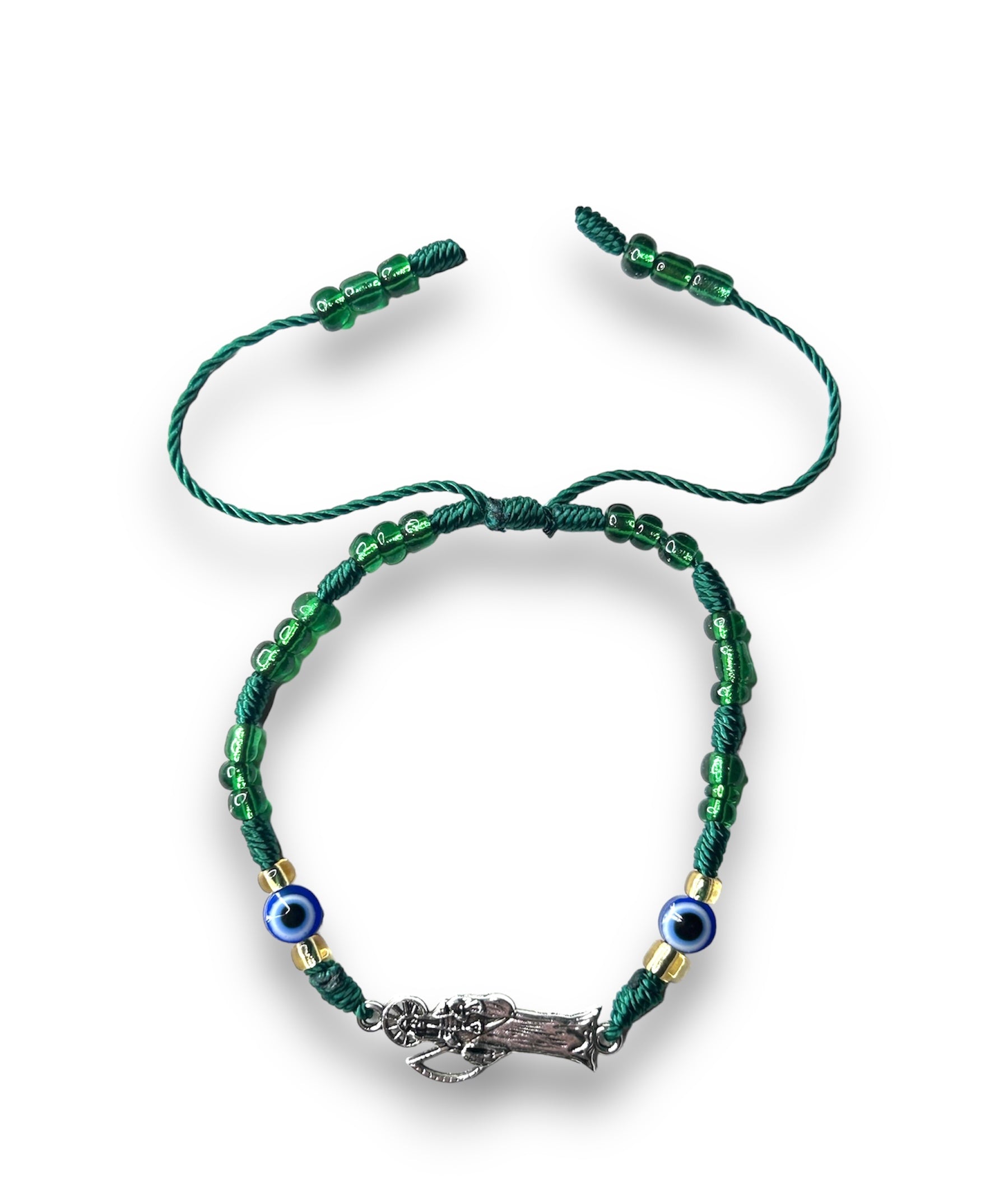 The color Green is associated with tranquility, wisdom, and protection, while the skull symbol can represent transformation, mortality, and the shedding of the old self. When combined, a white, Green Santa bracelet provides spiritual protection, ward off negative energies, and promote inner peace. It's often worn as a reminder of the transient nature of life and the importance of embracing change and personal growth.