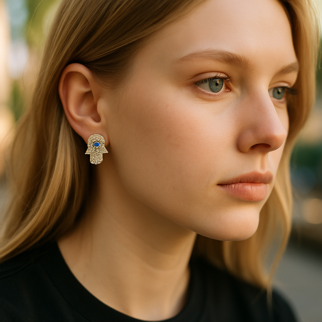 In radiant gold, the Hamsa Hand signifies blessings, power, and strength. Wearing these earrings is believed to invite the protective energy of the Hamsa, creating a shield against adversity and promoting a sense of spiritual well-being.