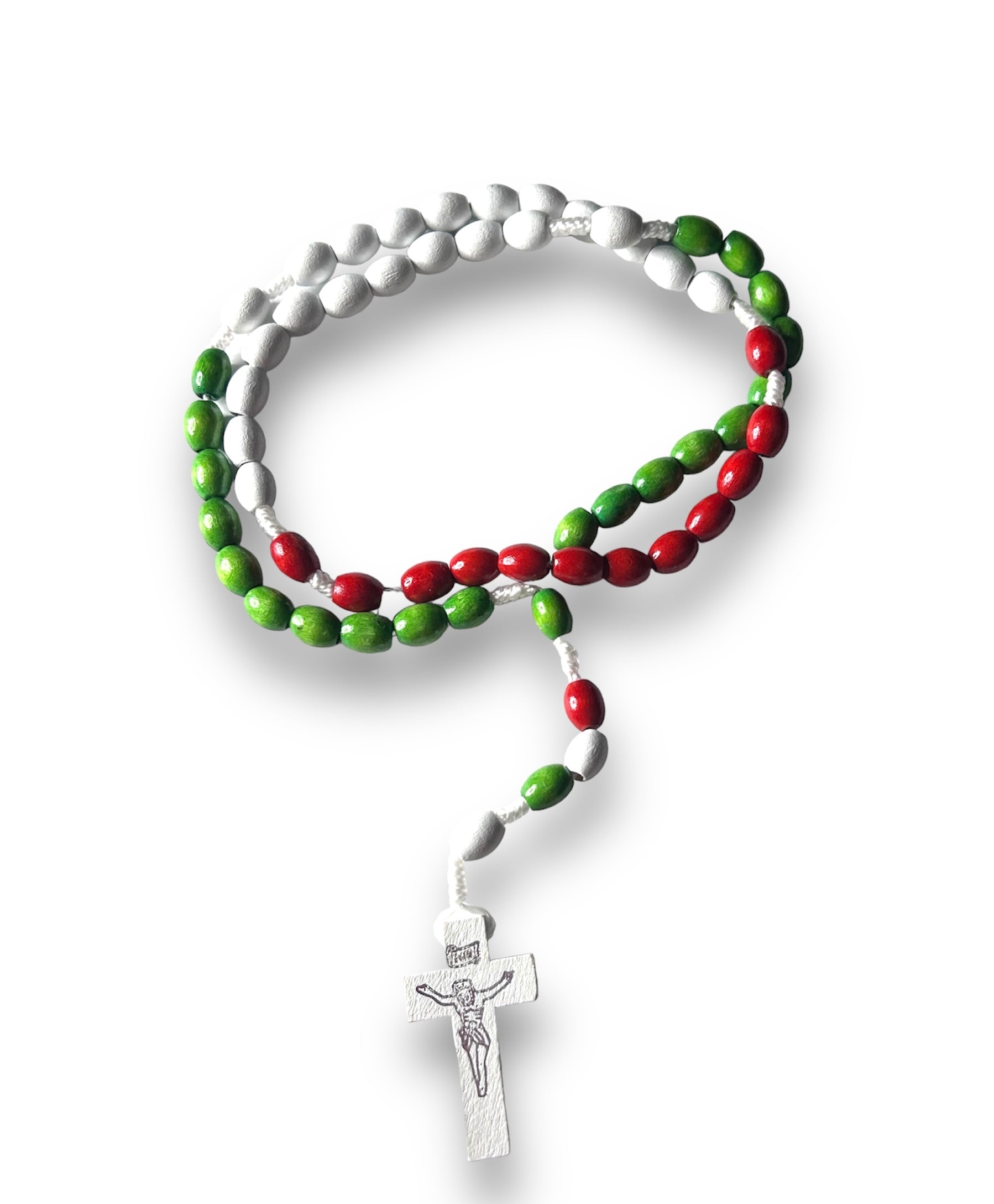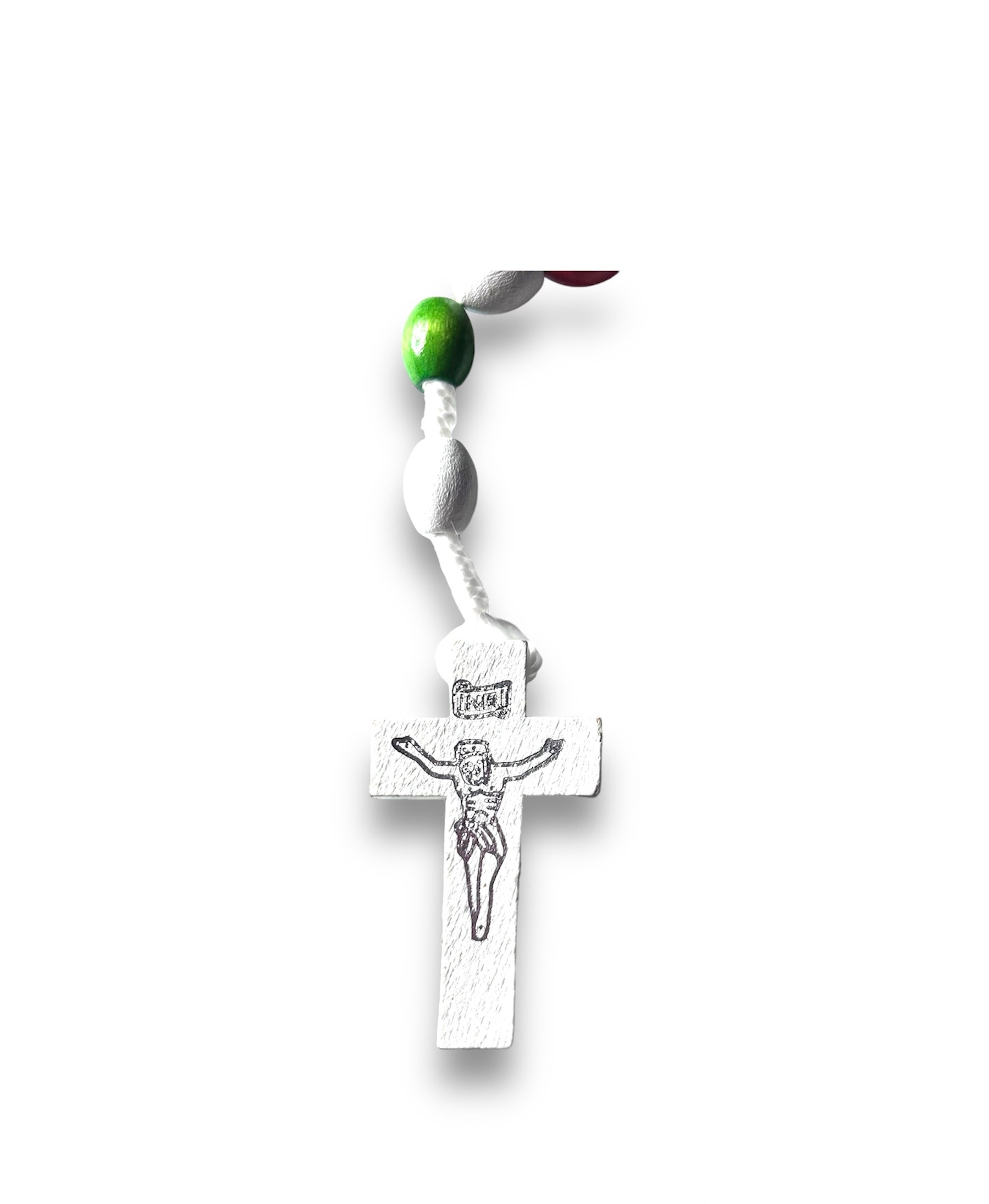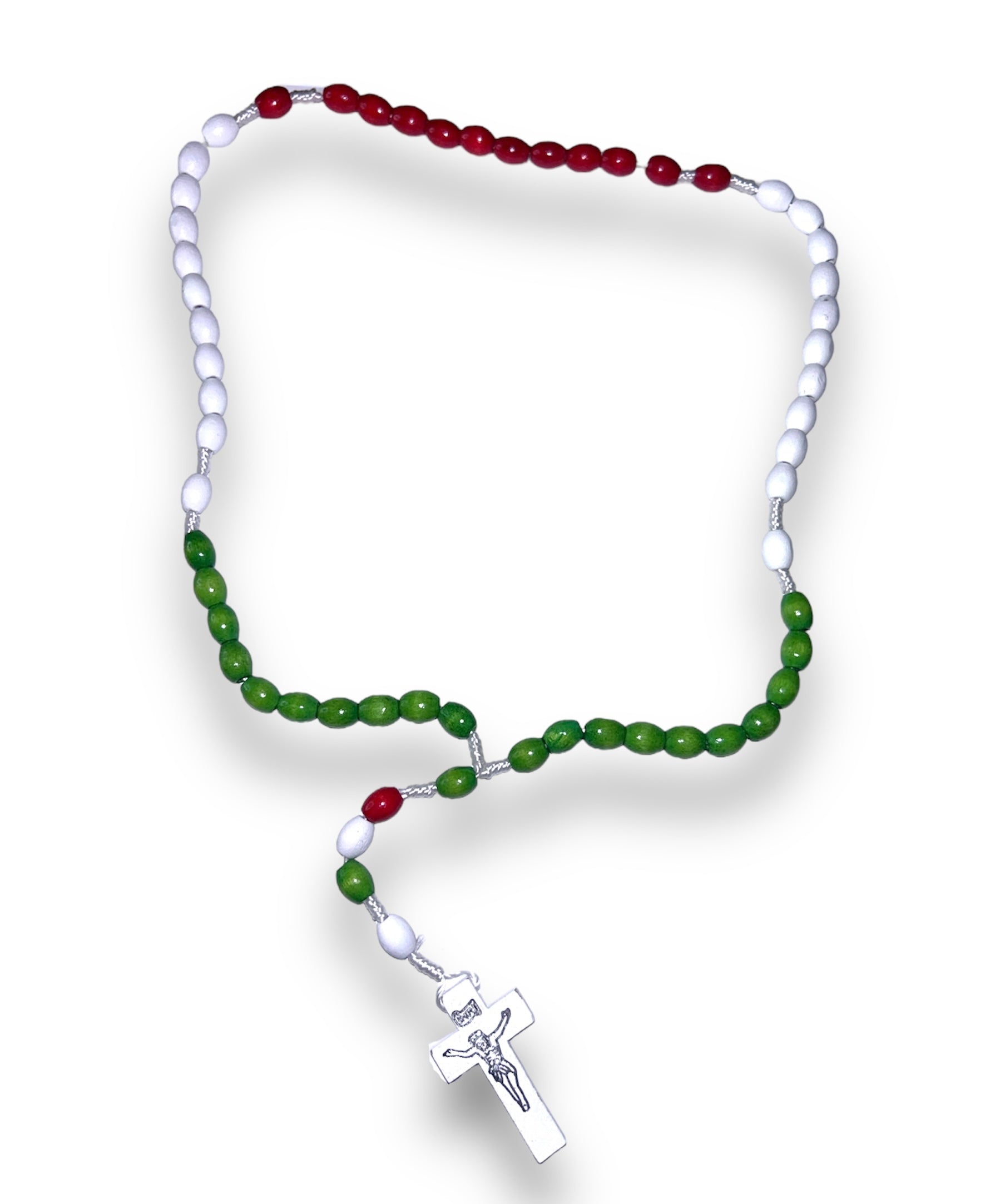 This necklace symbolizes deep faith and devotion, representing Jesus Christ's sacrifice and the spiritual strength found in Christian beliefs. The use of bright colors also signifies joy, hope, and the celebration of life, reflecting the vibrant nature of Mexican culture and its celebration of faith.