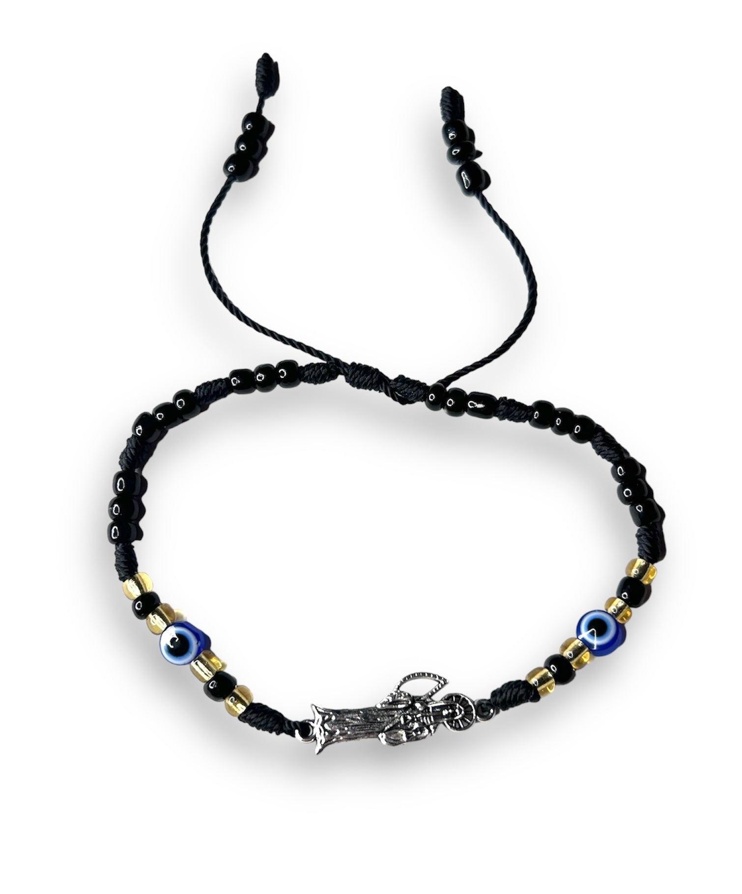 Black Santa Muerte Bracelet, adorned with a silver Santa Muerte full body pendant, blends vivid Gold and black colors symbolizing the balance between life and death, as well as protection and transformation. Santa Muerte, often depicted as a skeletal figure, is revered for her powerful protective qualities and guidance through challenges. The bracelet's color scheme reflects the dual nature of her influence, with gold symbolizing vitality and courage, while black represents protection and the unknown. This bracelet not only offers a striking look but also embodies spiritual strength and safeguarding for its wearer.