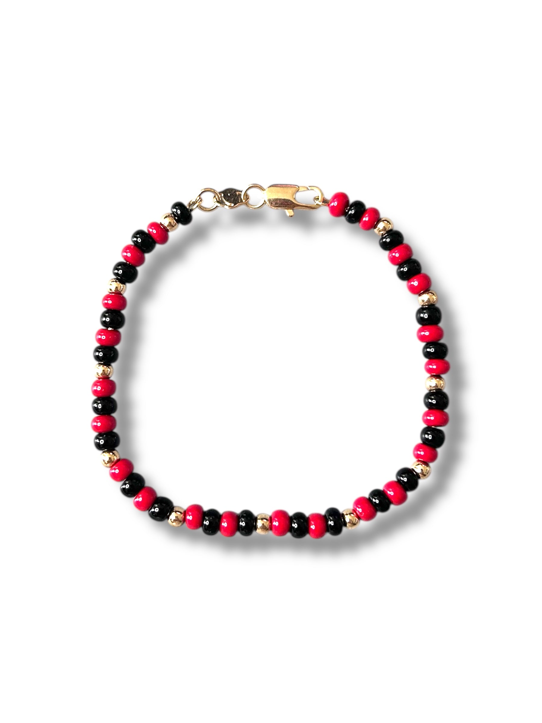 This gold-filled bracelet fuses red and black for a balance of energy and protection—red ignites passion and courage, while black shields against negativity and fear. The 11 gold beads symbolize alignment, focus, and mastery. Wear it as a symbol of controlled strength and silent authority—where presence alone demands respect.